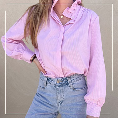 Prix 39,00 €Chemise rose en coton à rayures blanches et noires fines, col montant en froufrous. Coupe droite. Ne se froisse pas. Prenez votre taille habituelle. -
