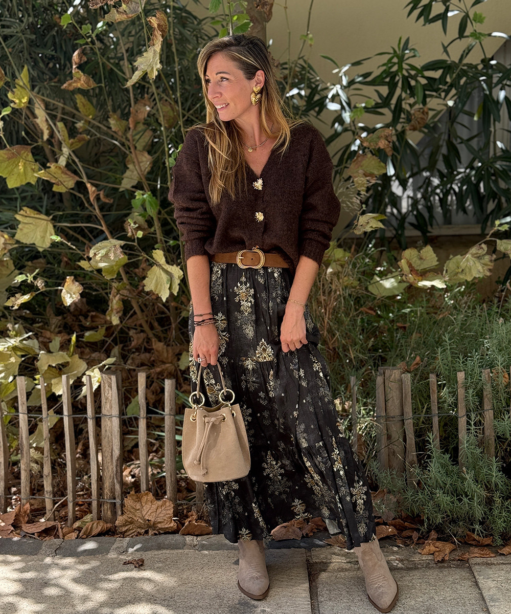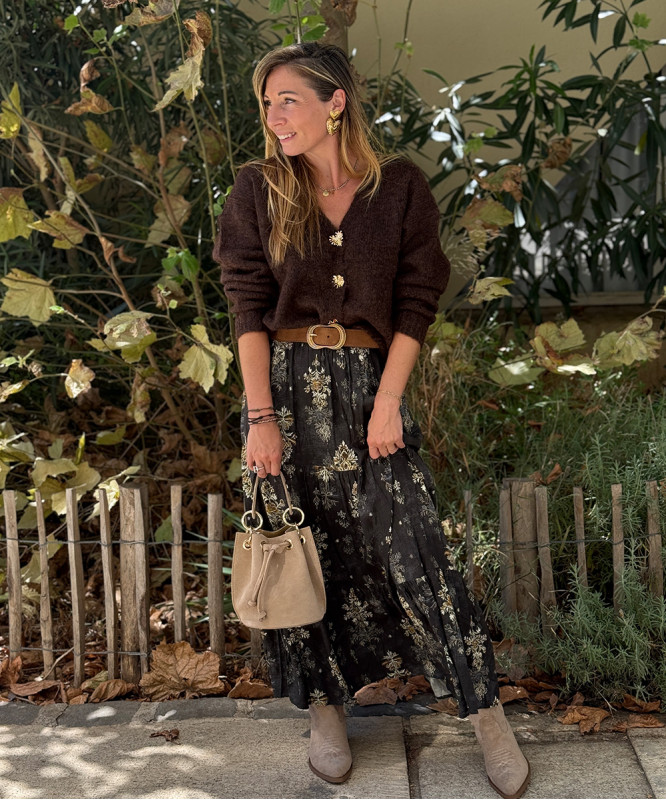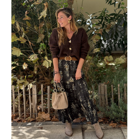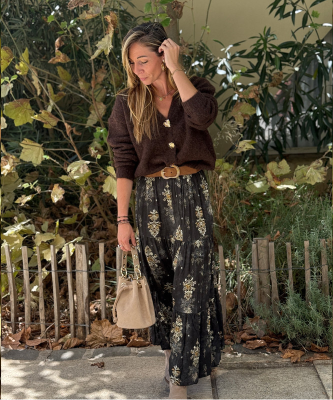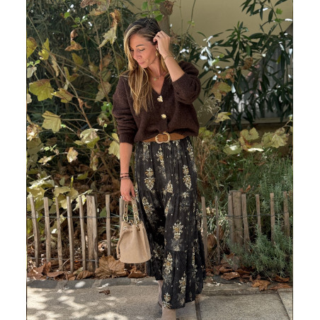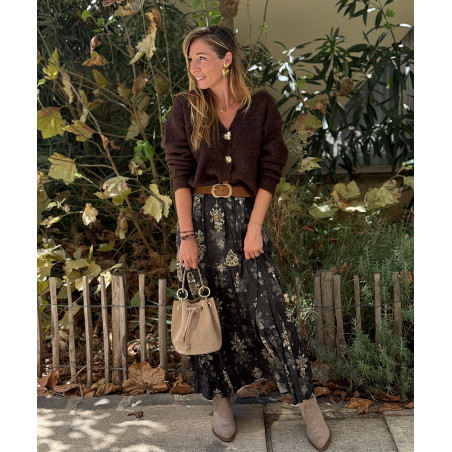 Jupe longue verts satin motifs marrons, ceinture élastique.