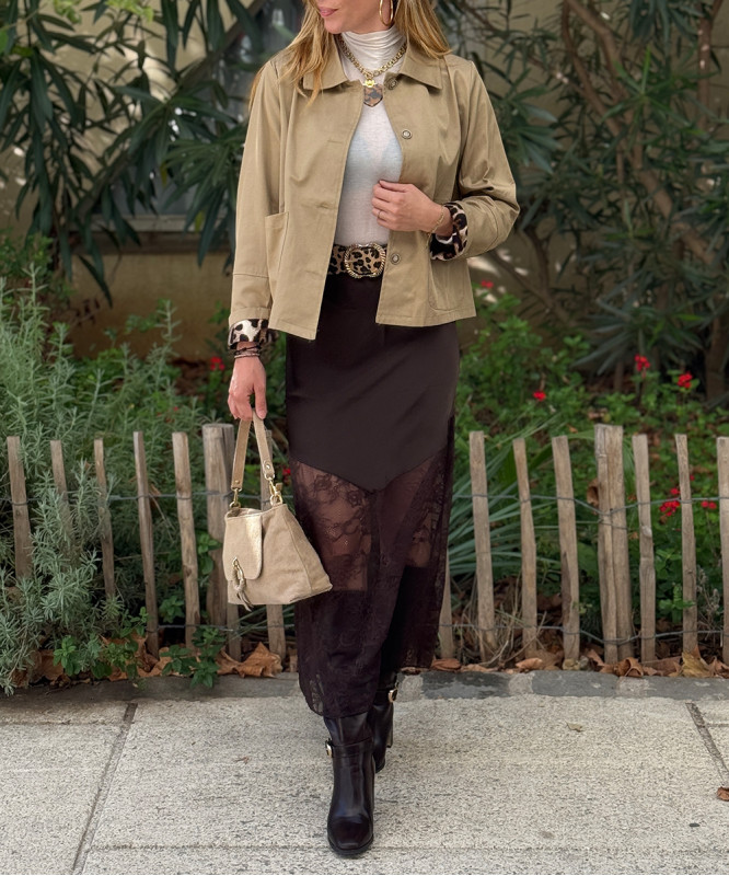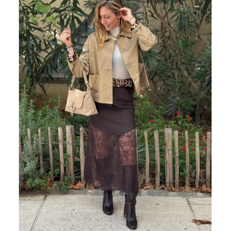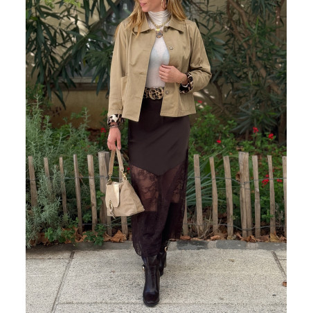 Jupe marron en satin et dentelle, jeu de transparence à partir des genoux. Taille unique du 34 au 40. Centure élastiquée.