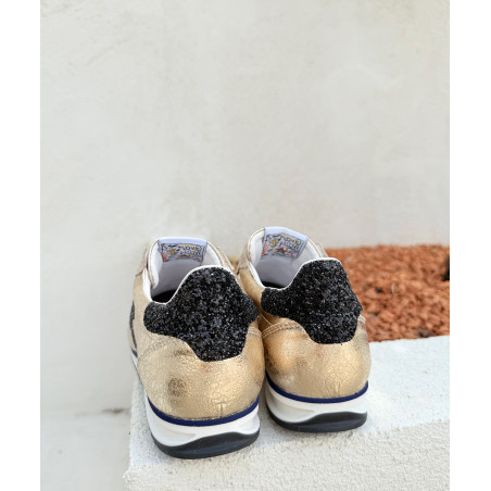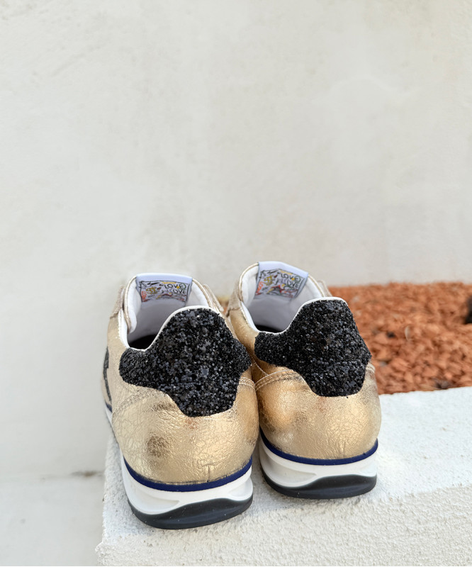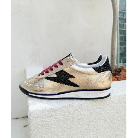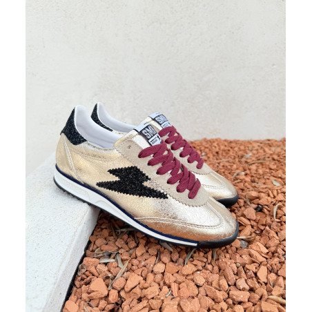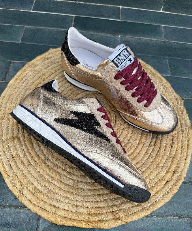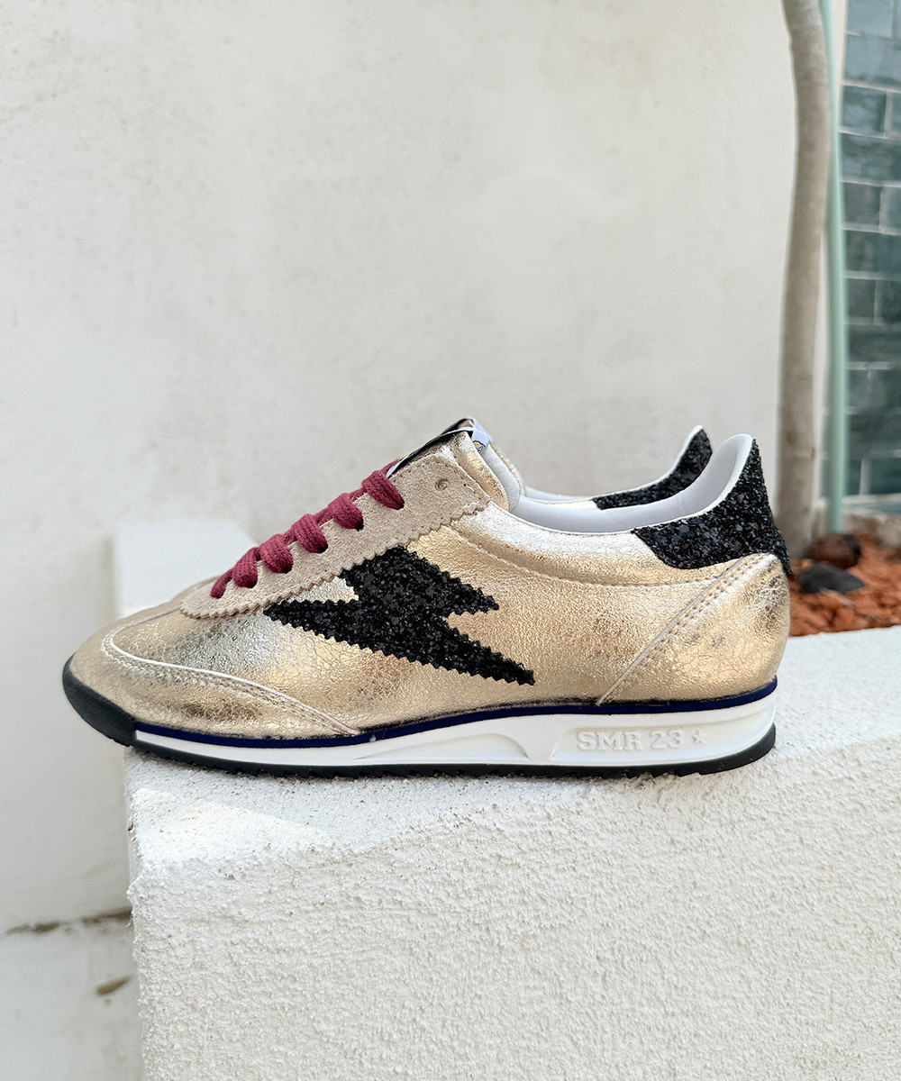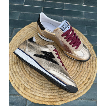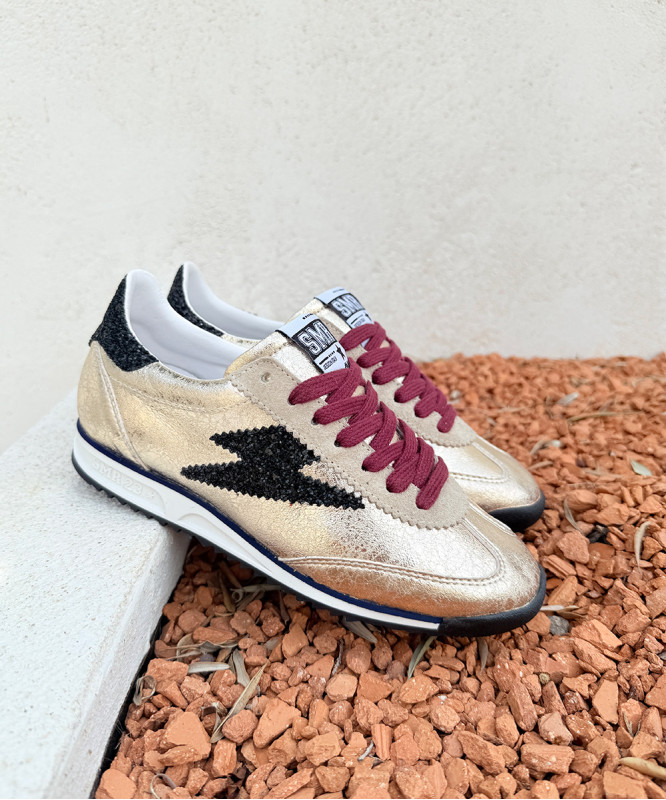 Baskets Semerdjian doré et glitter noir, lacets bordeaux, semelle fine légèrement crantée. 100% cuir italien. Prenez votre pointure habituelle, si vous êtes entre 2 pointures optez pour la plus petite des 2