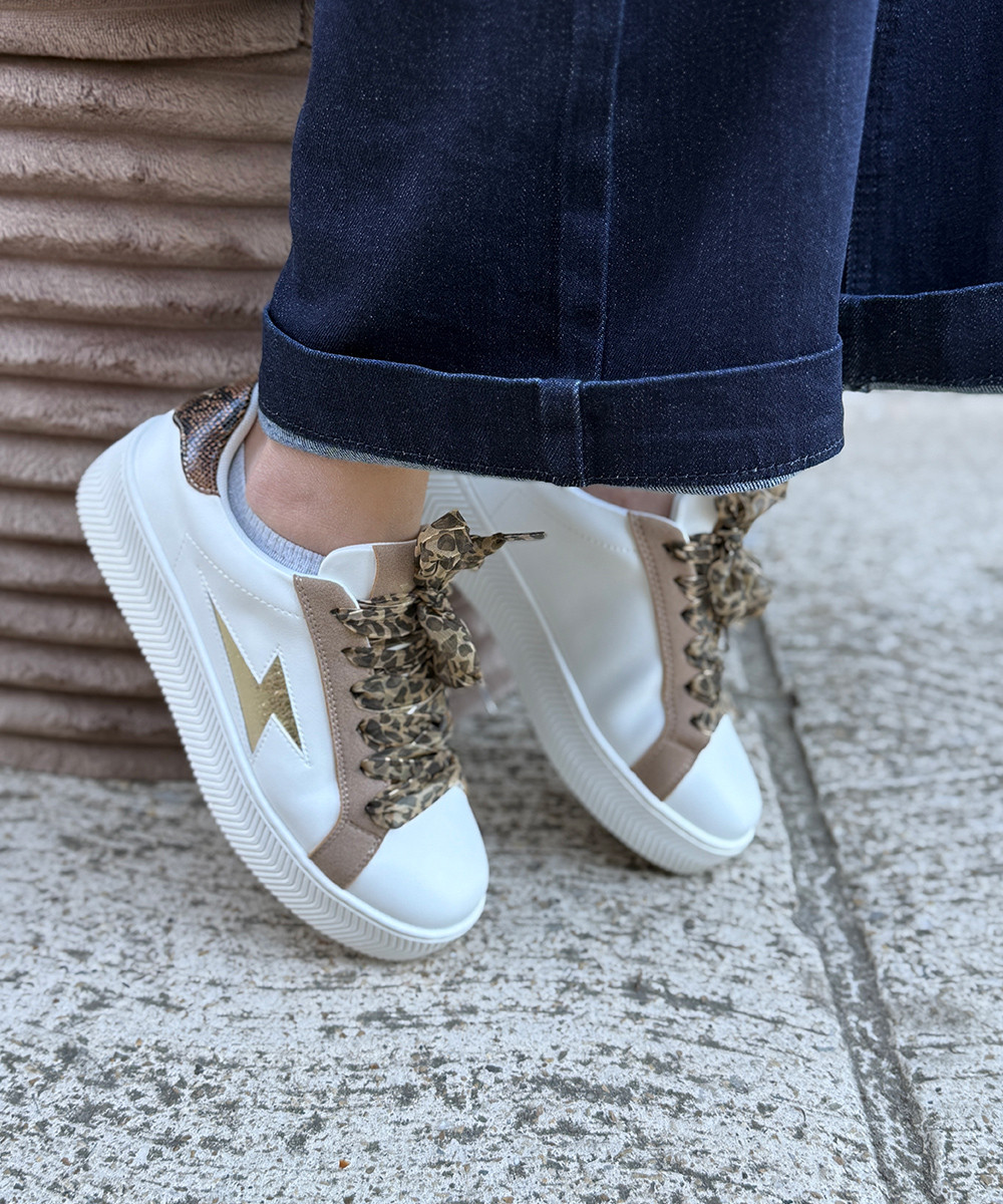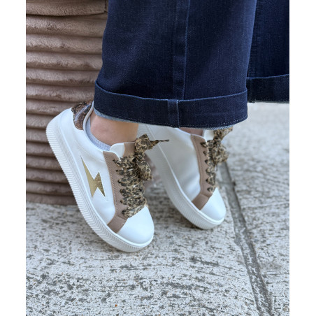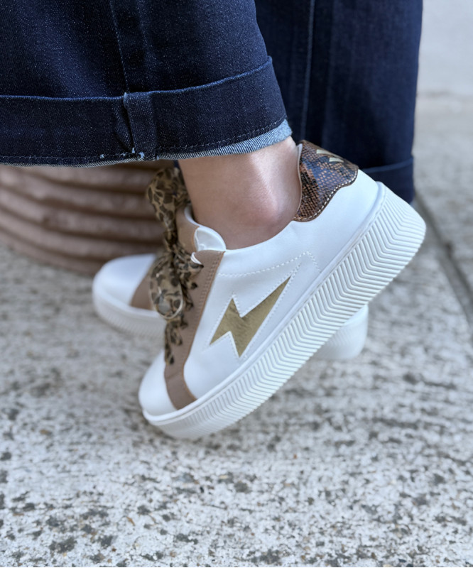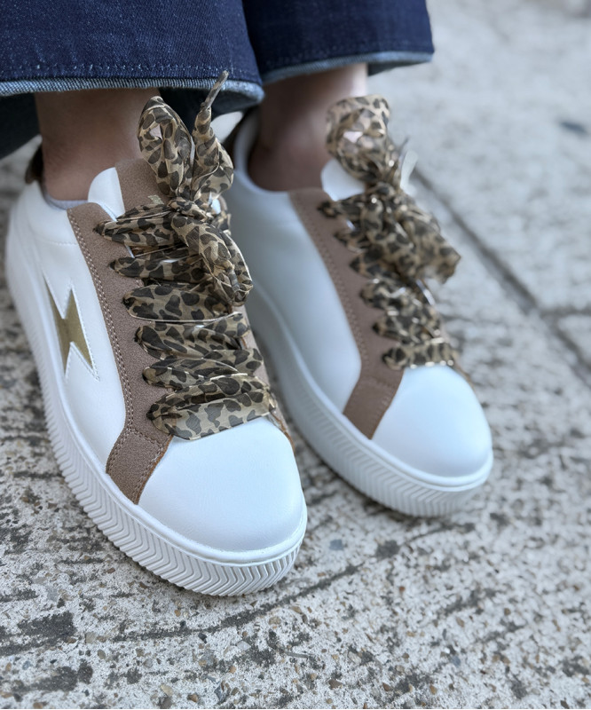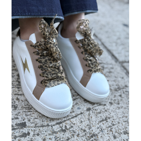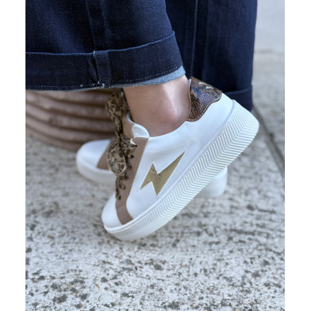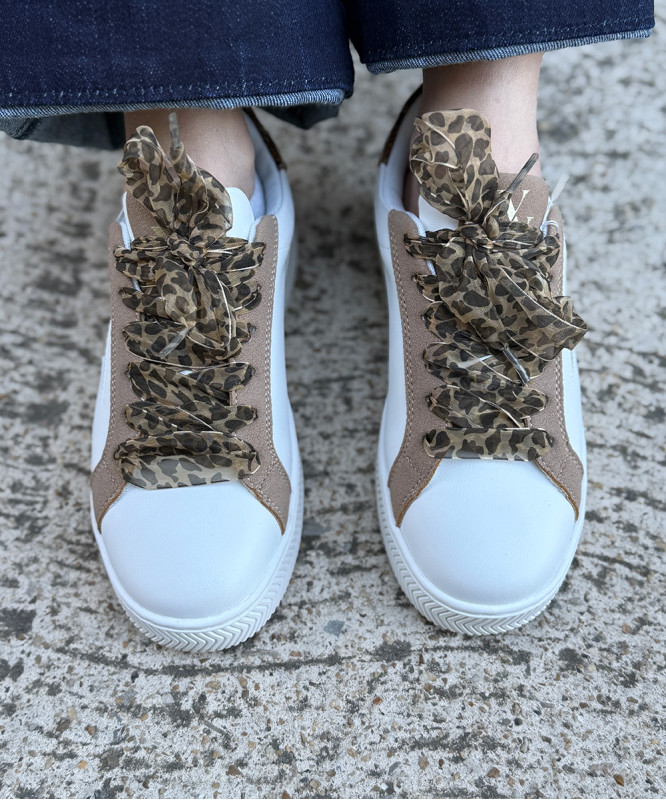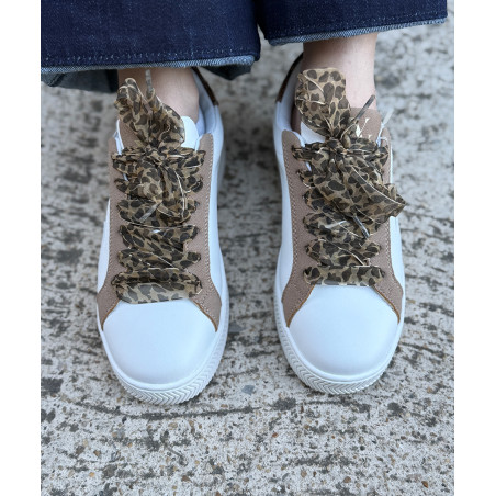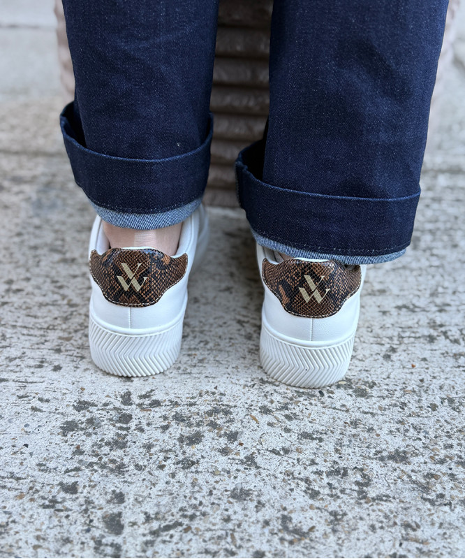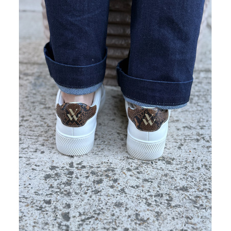 Baskets Wanessa Wu blanches et camel arrière python, lacet en tissu effet ruban motif léopard. Semelle intérieure amovible effet massant. Bout rond, prenez votre pointure habituelle. Semelle épaisse de 4 cm de haut. Confort +++