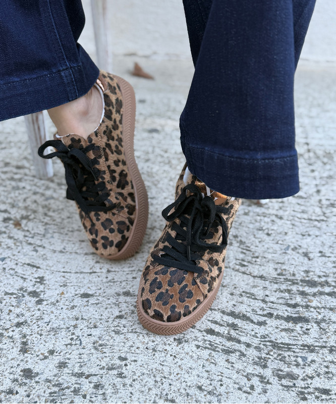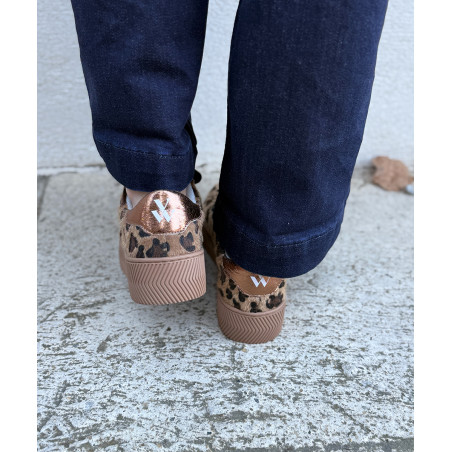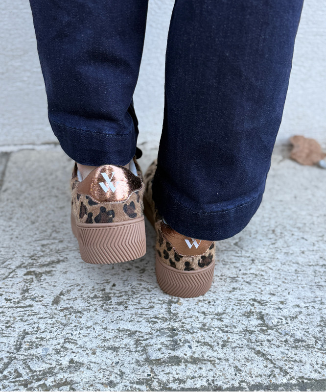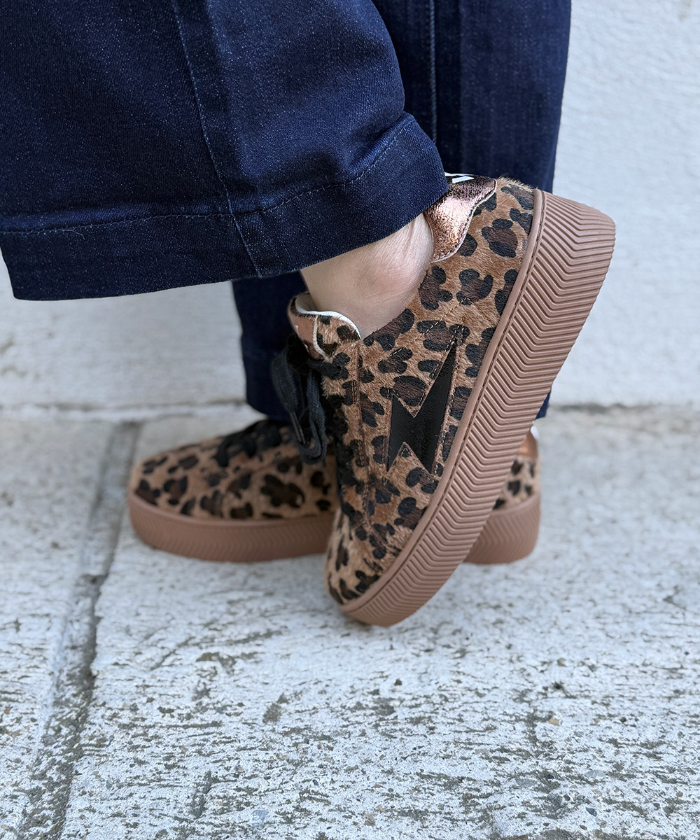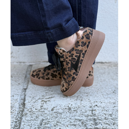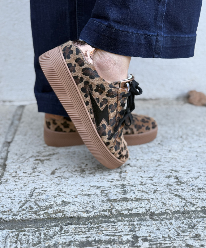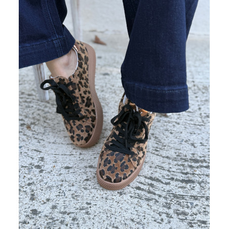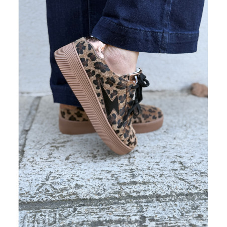 Baskets Wanessa Wu effet poulain à motif léopard, lacets noirs. Bout rond. Semelle intérieure amovible à micro-billes effet massant. Semelle épaisse de 4 cm camel à motifs chevrons.  Prenez votre pointure habituelle. Confort +++