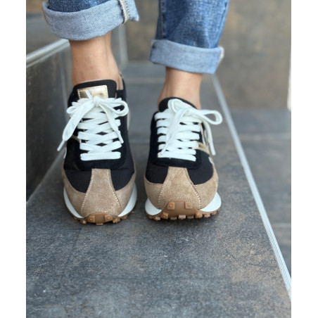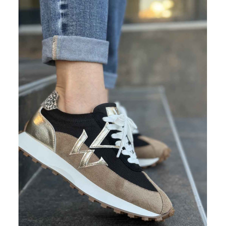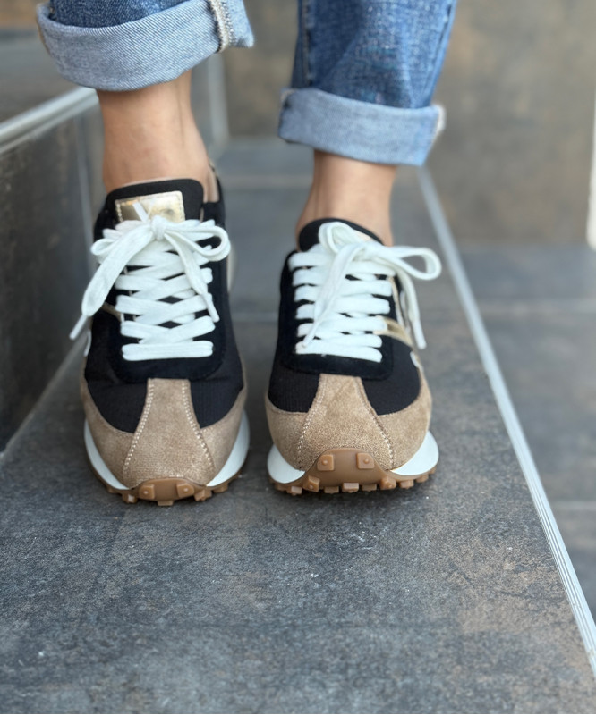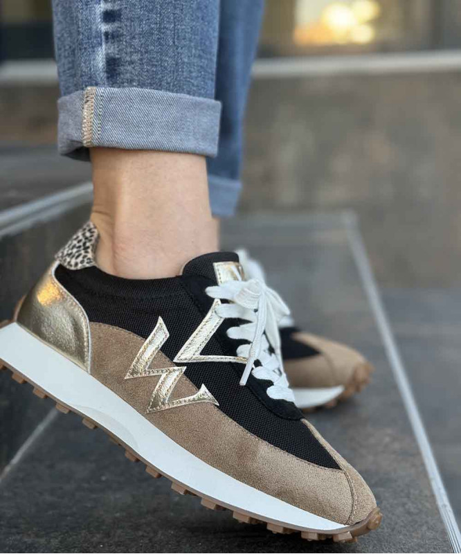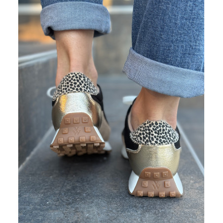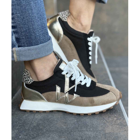 Baskets Vanessa Wu noir camel et léopard, modèle Pia, semelle plus épaisse à l'arrière qu'à l'avant pour plus de confort. Vous apprécierez la petite touche léopard chic à l'arrière et le fait qu'elles se marient facilement avec tout. Prenez votre pointure habituelle.