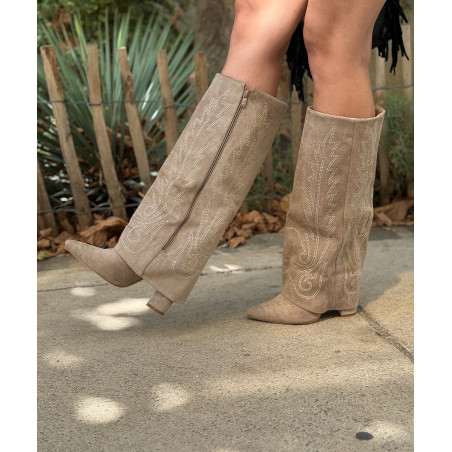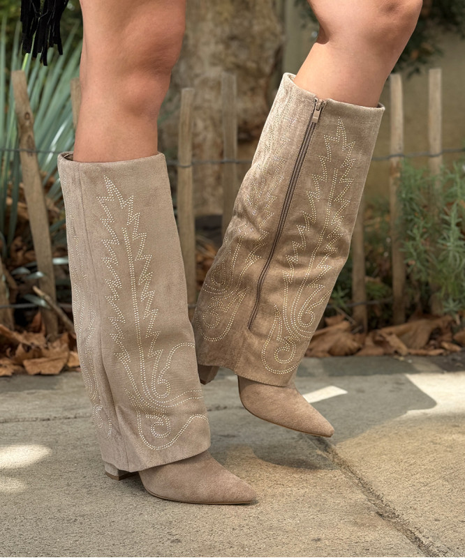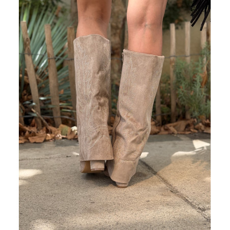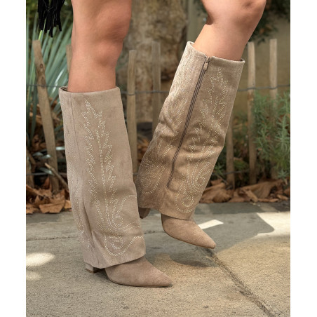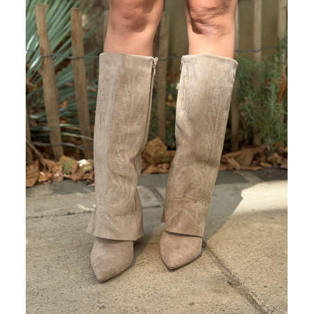 Santiags hautes à rabat beiges à strass, talon de 10 cm.
