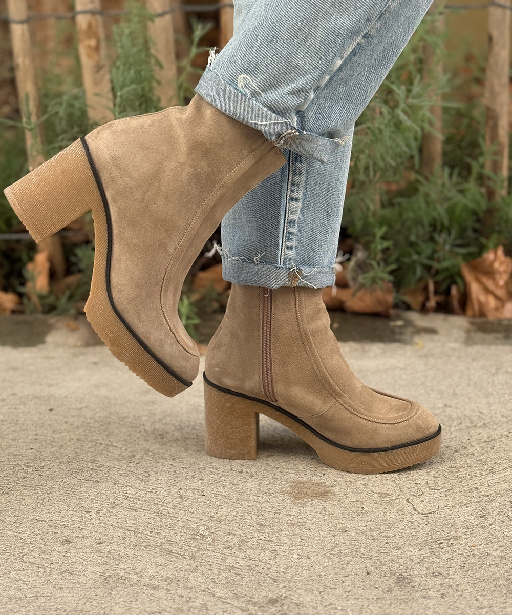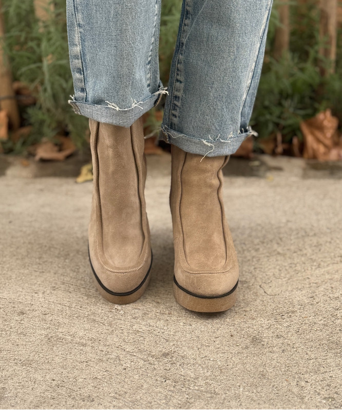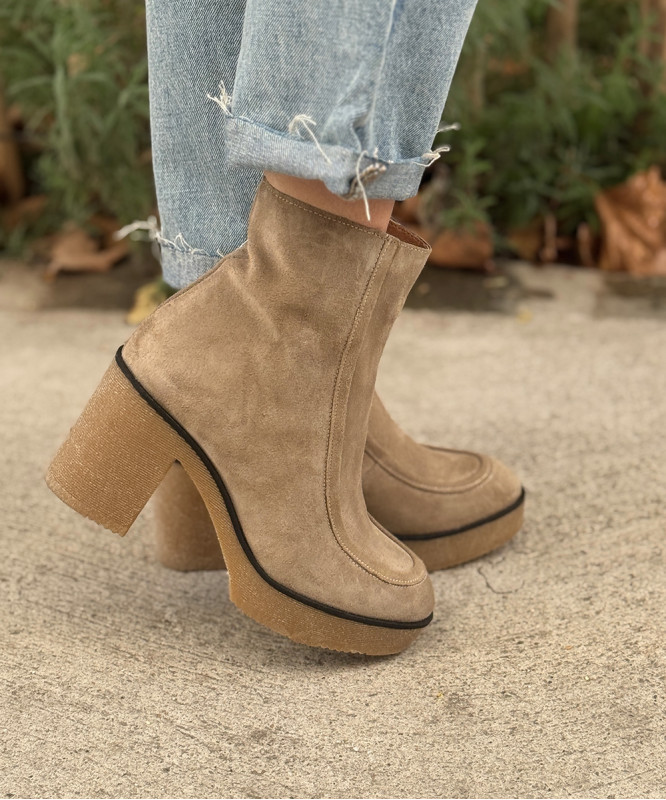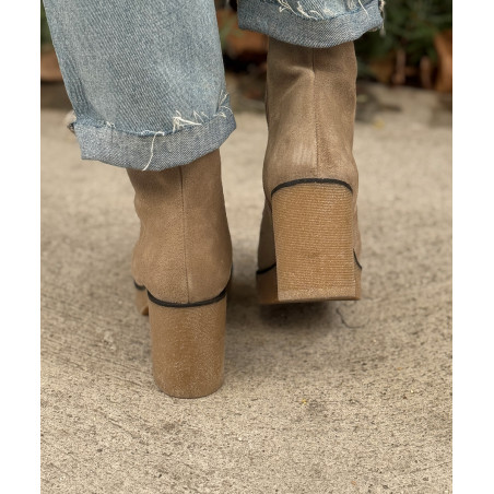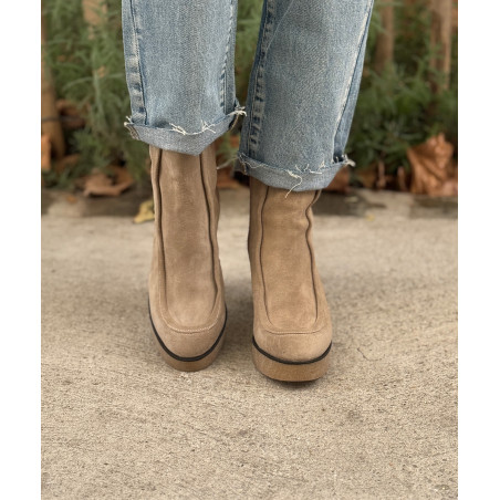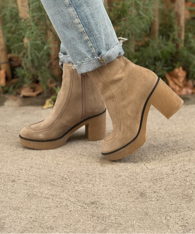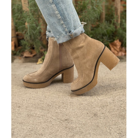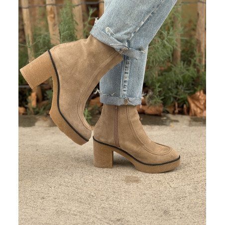 Bottines en daim beige talon et semelle en crêpe, fermeture éclair pour les mettre. Prendre votre pointure habituelle. La forme arrondie sur le dessus de la chaussure allonge la jambe. Talon de 6 cm. Confort +++