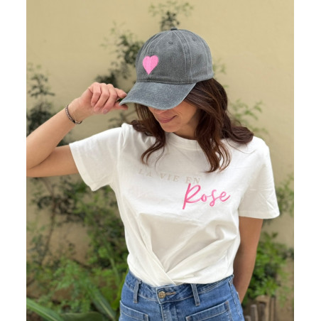 Casquette gris délavé coeur rose, coton, taille unique. Boucle inox à l'arrière pour le réglage.