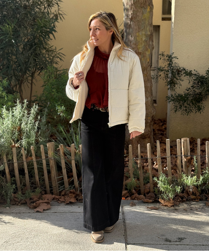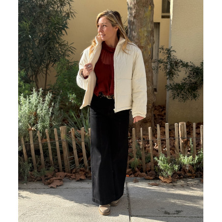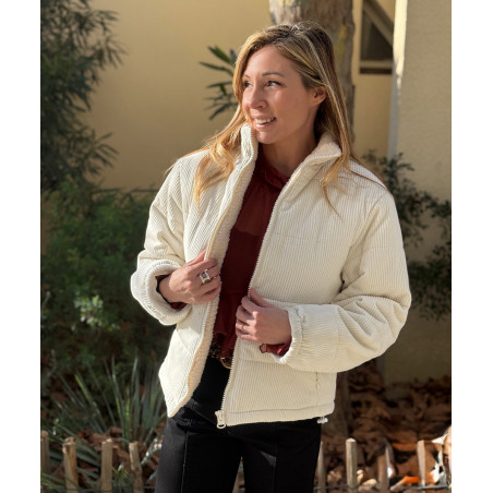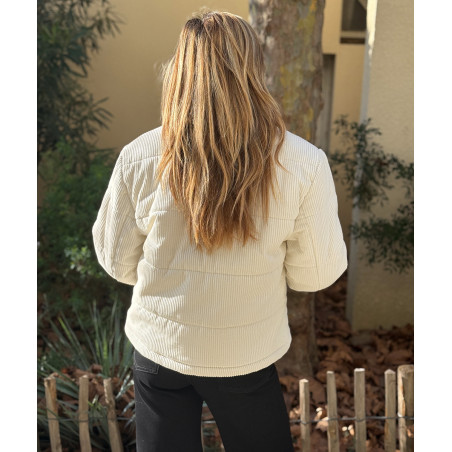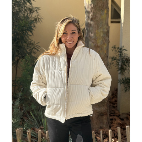Veste style doudoune en velours écru, doublée moumoute. Modèle court qui se resserre sur le bas pour un effet plus bombers.