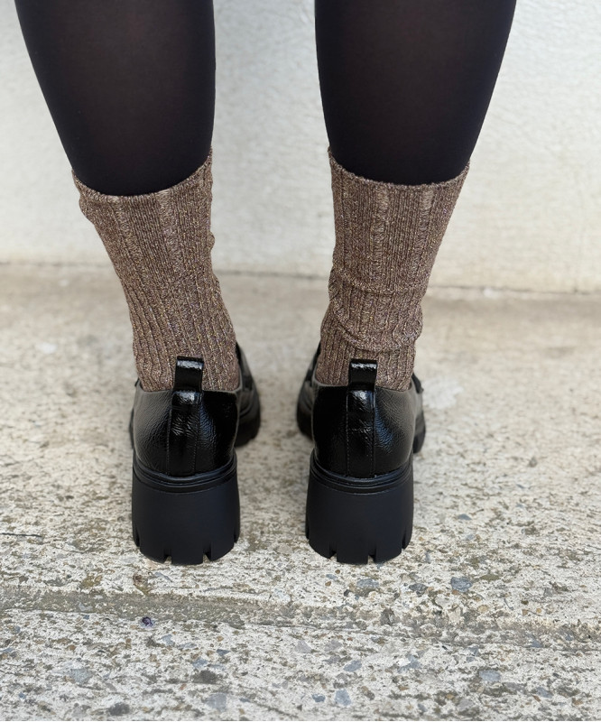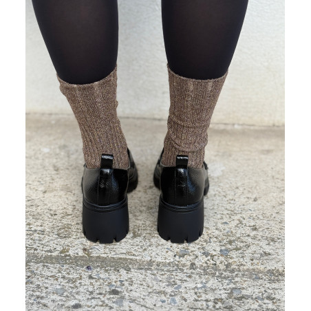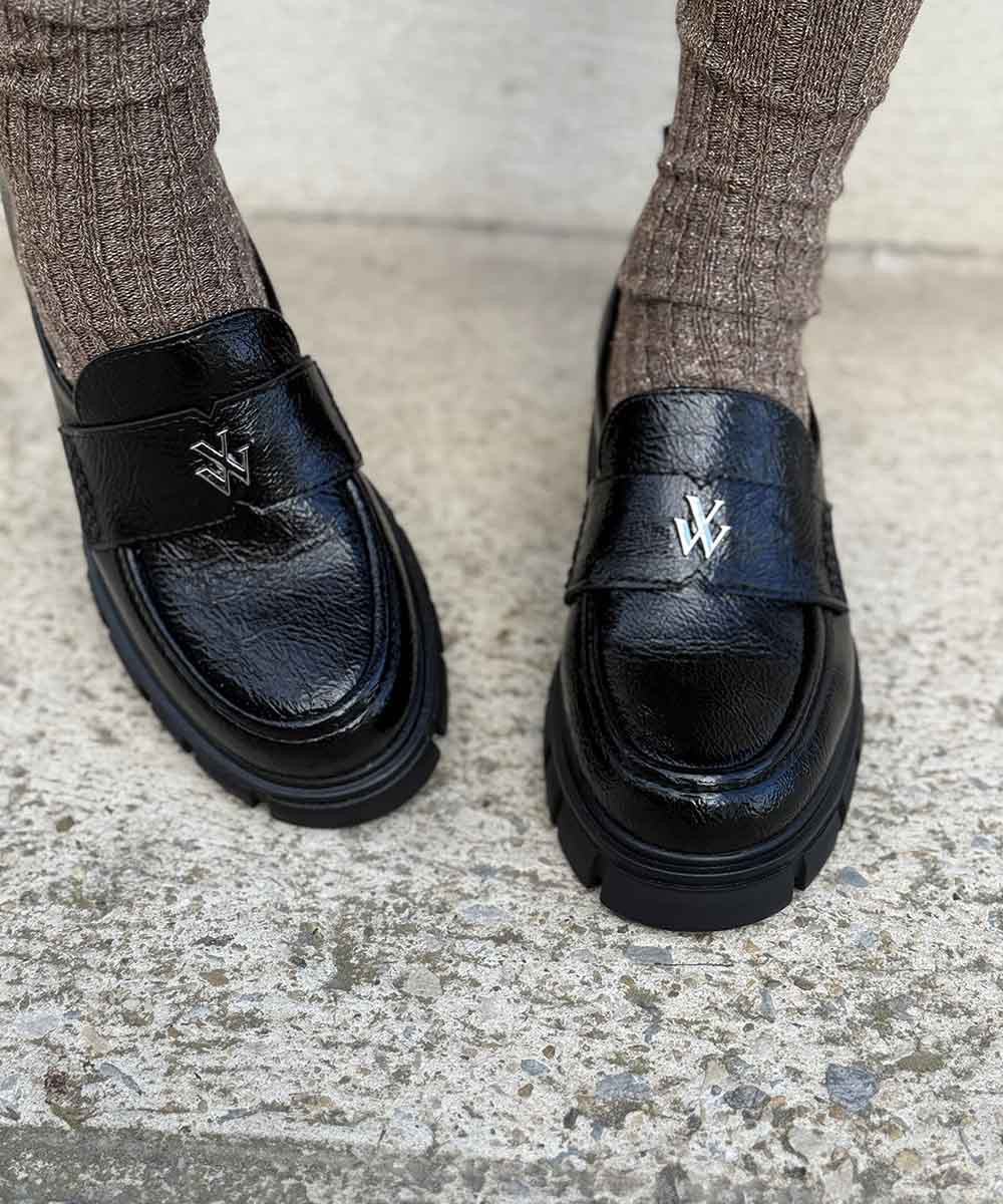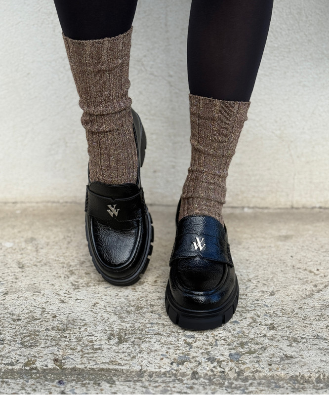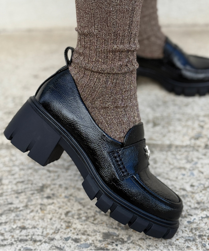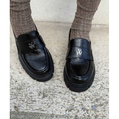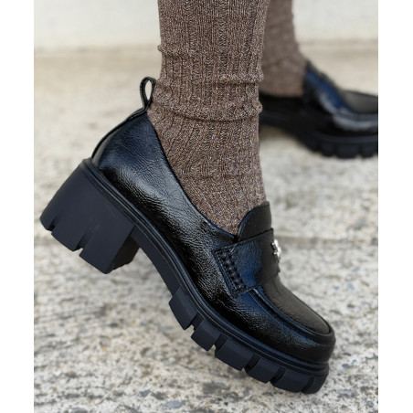 Mocassins noirs vernis effet vieilli, semelle chic et tendance. Talon haut de 5 cm compensé à l'avant. Très confortables. Prenez votre pointure habituelle, si vous êtes entre deux pointures optez pour la plus petite des deux. Pieds fins à pieds normaux.