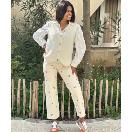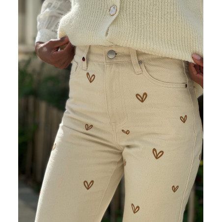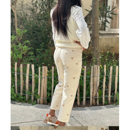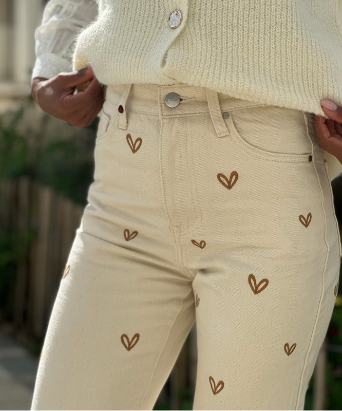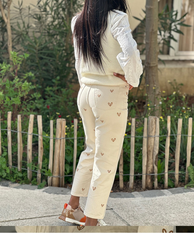 Jean 100% coton beige coeurs brodés marrons, coupe straight ankle, près du corps aux anches et fesses, jambes droites coupé 7/8ème.
