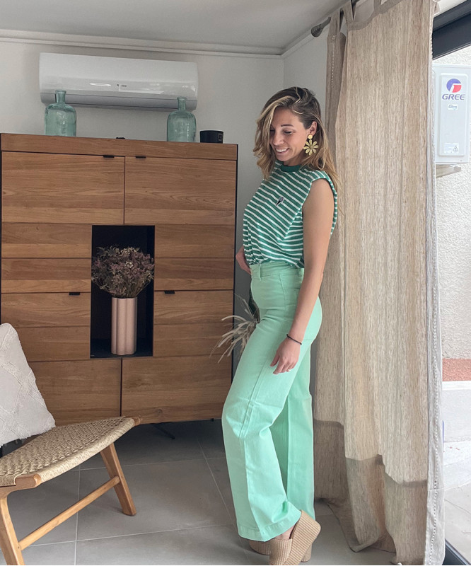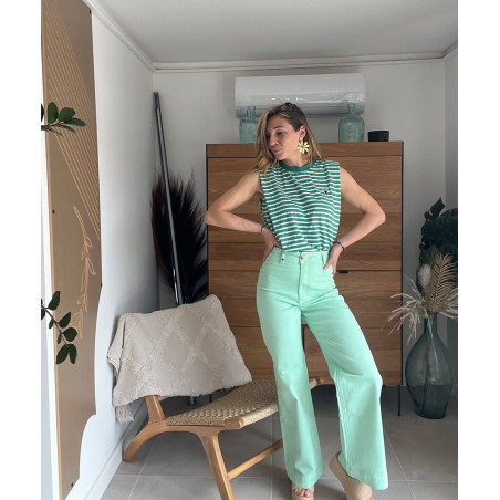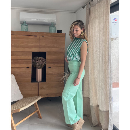 Pantalon vert d'eau, taille haute coupe évasée 98% coton 2% élasthanne. Longueuur normale, le modèle mesure 1m60 et porte un XS pour son 34 habituel.