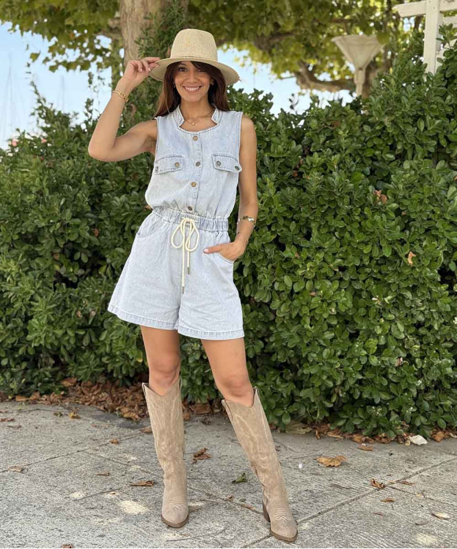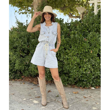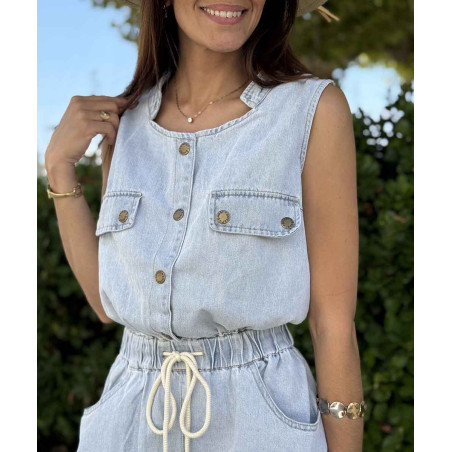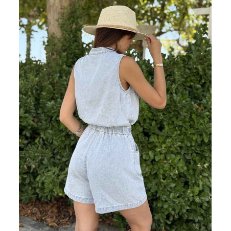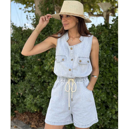 Combi short en denim bleu clair, ceinturée à la taille avec un lien de resserrage. Boutons tout le long du buste. 100% coton. Très bien coupée.