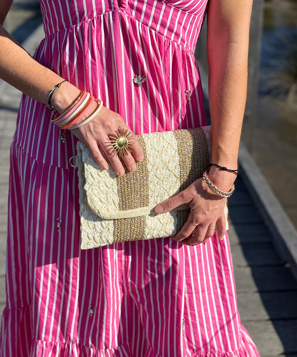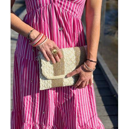 Pochette doré et beige à rabat avec bandoulière camel en simili cuir + petite anse pour la porter au poignet