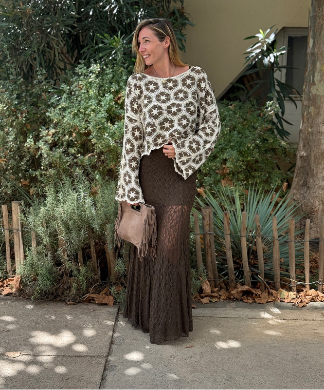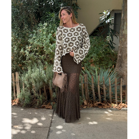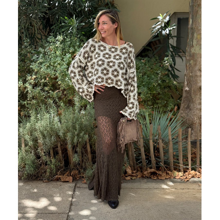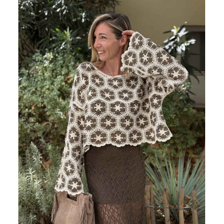Pull court en crochet kaki et beige