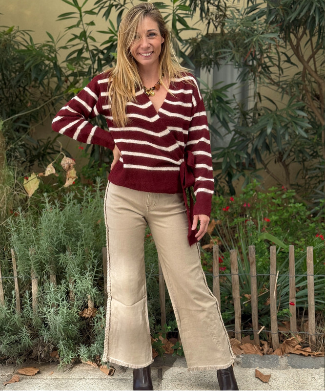 Pull portefeuille bordeaux à rayures blanches, taille unique convient du 34 au 40.