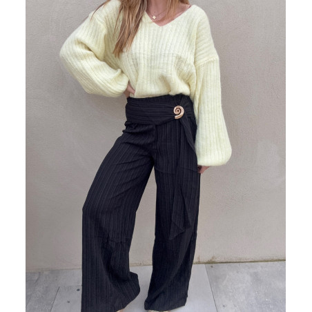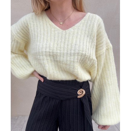 Pull jaune pastel, col V plutôt court, manches ballon.