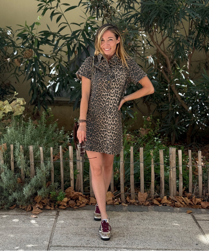 Robe courte léopard, 100% coton, effet jean, manches courtes.