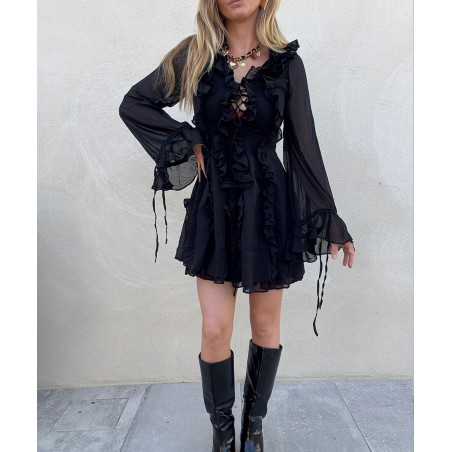 Robe noire à froufrous, S pour le 34-36 M pour le 38 et L pour le 40. Lien de resserrage au niveau du décolleté, manches transparentes, lien de resserage au niveau des poignets. Entièrement doublée