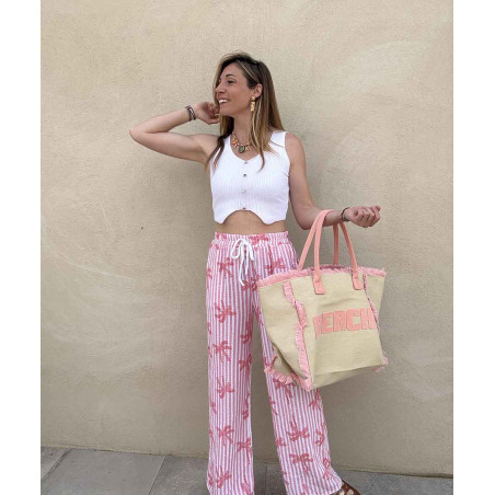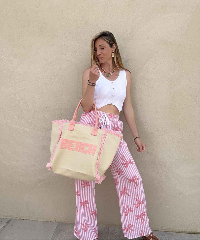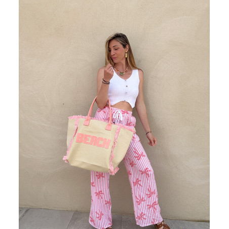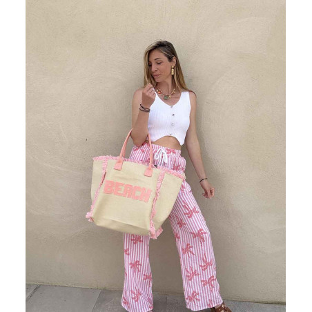 Sac beach beige et franges rose saumon, entièrement doublée. fermeture éclair. Taille 56x35x22 cm