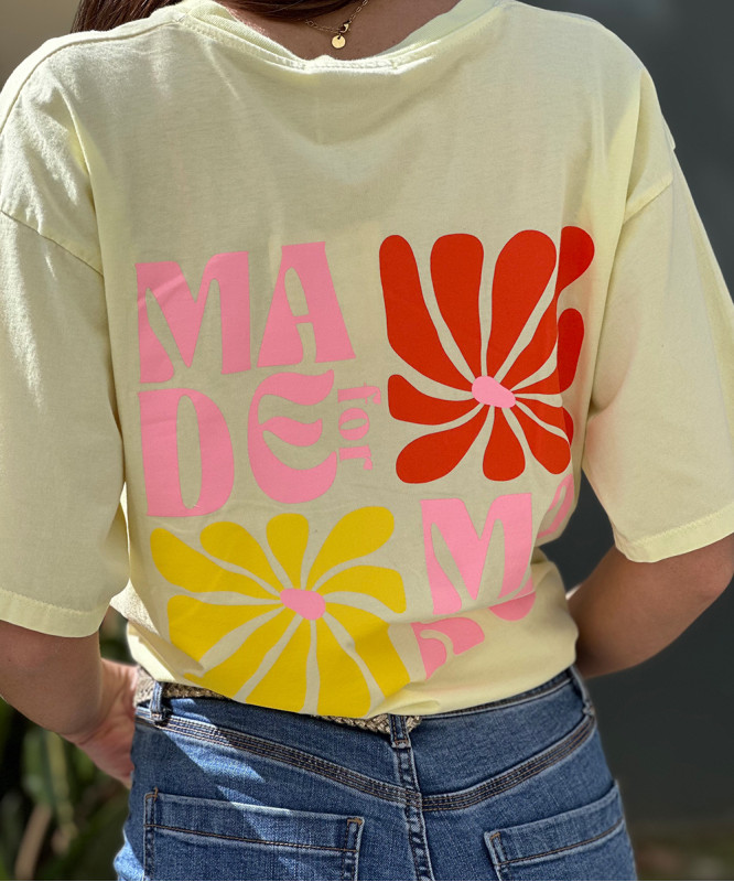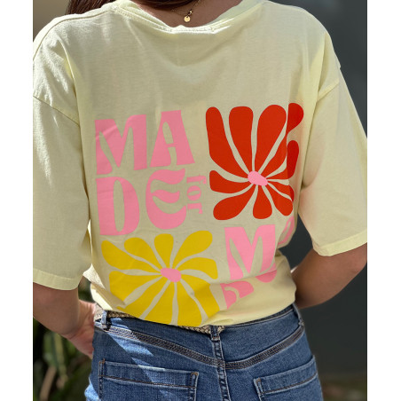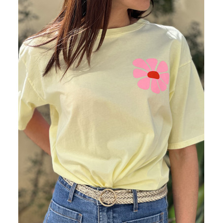 T-shirt jaune coton à fleurs, 100% coton style oversize, taille unique convient parfaitement du 34 au 42