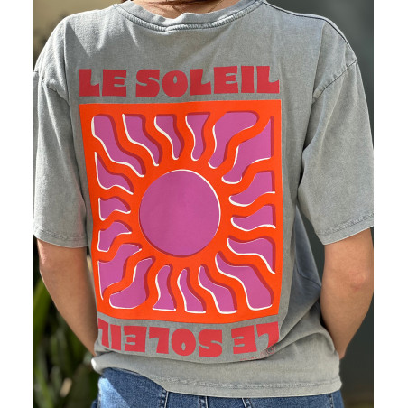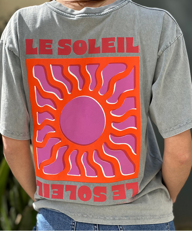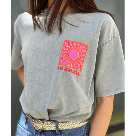 T-shirt gris délavé Le soleil, 100% coton style oversize, taille unique parfait du 34 au 42
