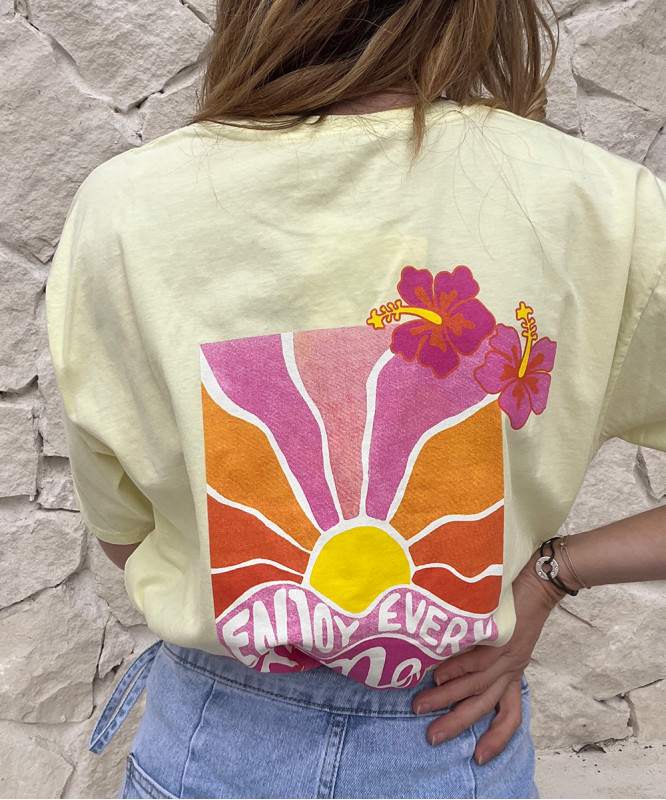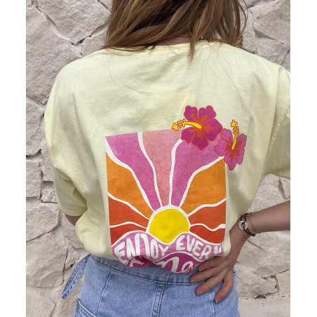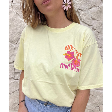 Tee-shirt jaune Enjoy every moment, 100% coton, look oversize. Taille unique, convient du 34 au 44.