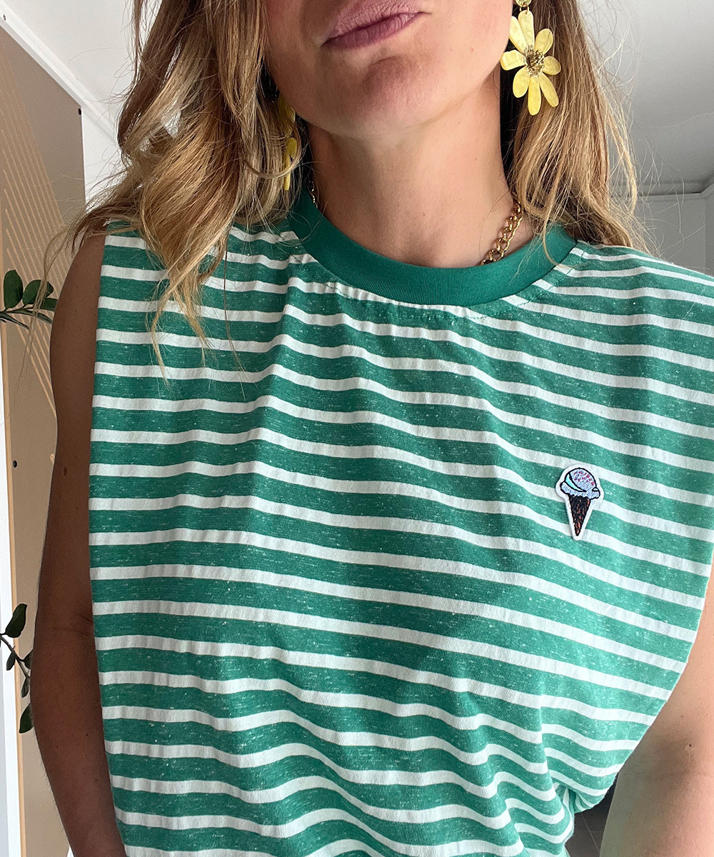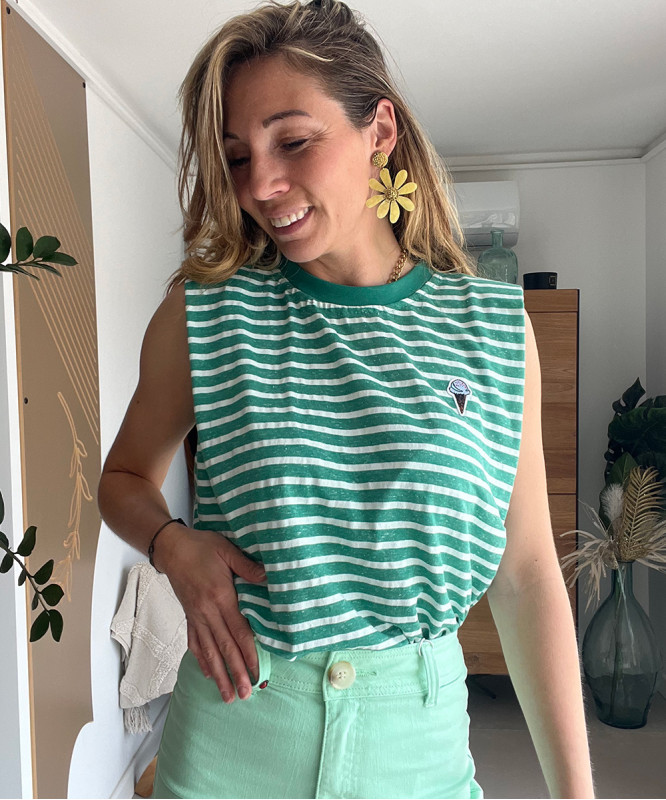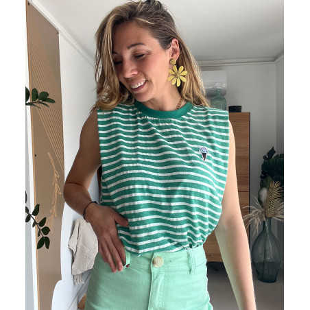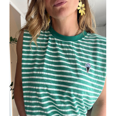 Top à rayures vert à épaulettes, petite glace brodé sur le côté gauche