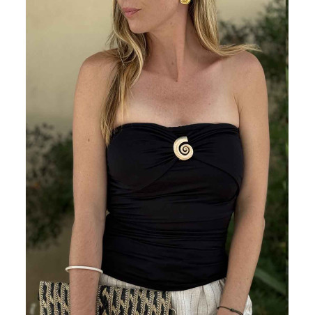 Top noir matière élastique, bon maintien au dessus de la poitrine. Coque amovibles. Taille unique, il conviendra parfaitement du 34 au 38.