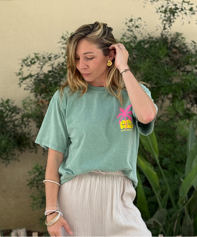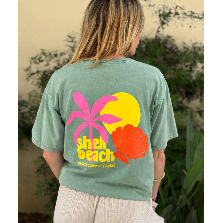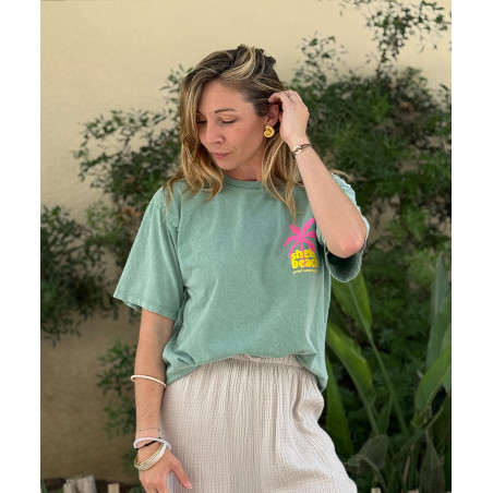 Tee-shirt coton vert Beach coloré, taille unique, parfait du 34 au 42, style oversize.