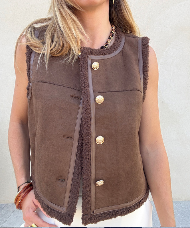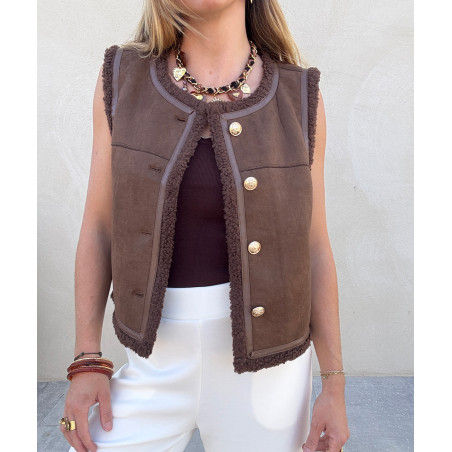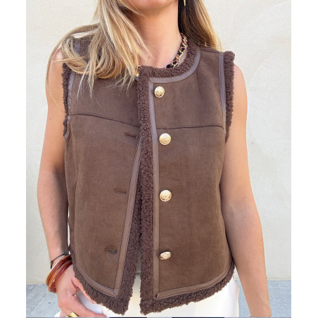 Veste sans manches doublée moumoute marron effet daim. S/M pour le 34-36 M/L pour le 38/40